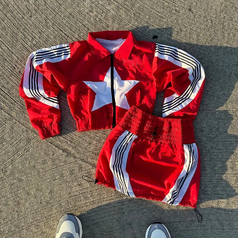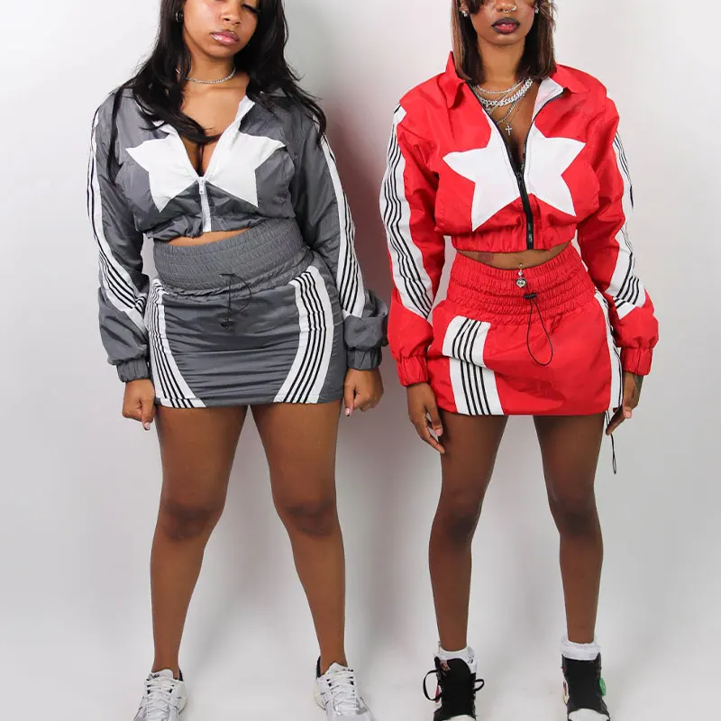 Huili Manufacturer Custom Logo Women Activewear Sets Color Block Patchwork Zip up Windbreaker Jacket Nylon Short Skirt TrackSuit